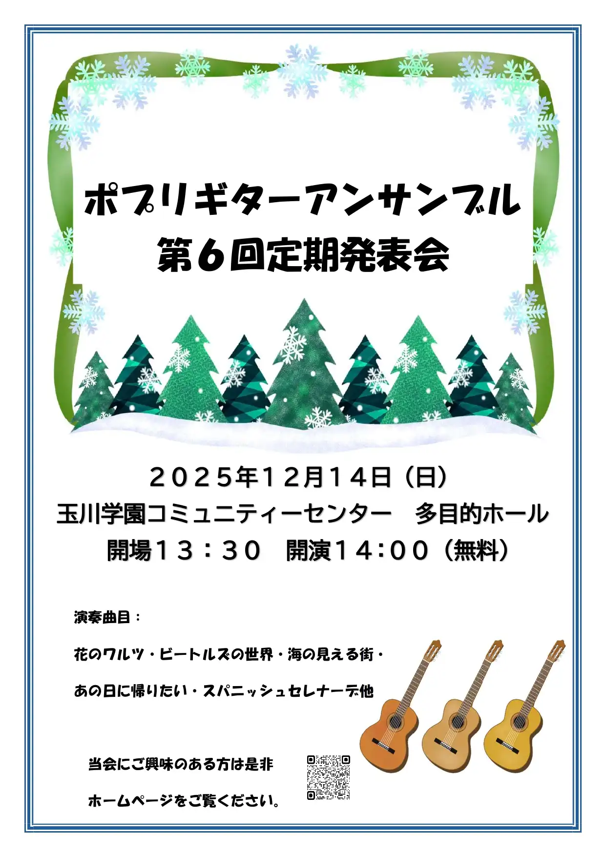 11/2(日)玉川学園コミュニティーセンターまつり出演 ・会場:玉川学園コミュニティーセンター(ホール) ・13時開演(入場無料) ・曲目:①海の見える街(久石譲) ②ビートルズの世界(Beatles) Help! ~ And I Love Her ~ Eleanor Rigby ③花のワルツ(Tchaikovsky)